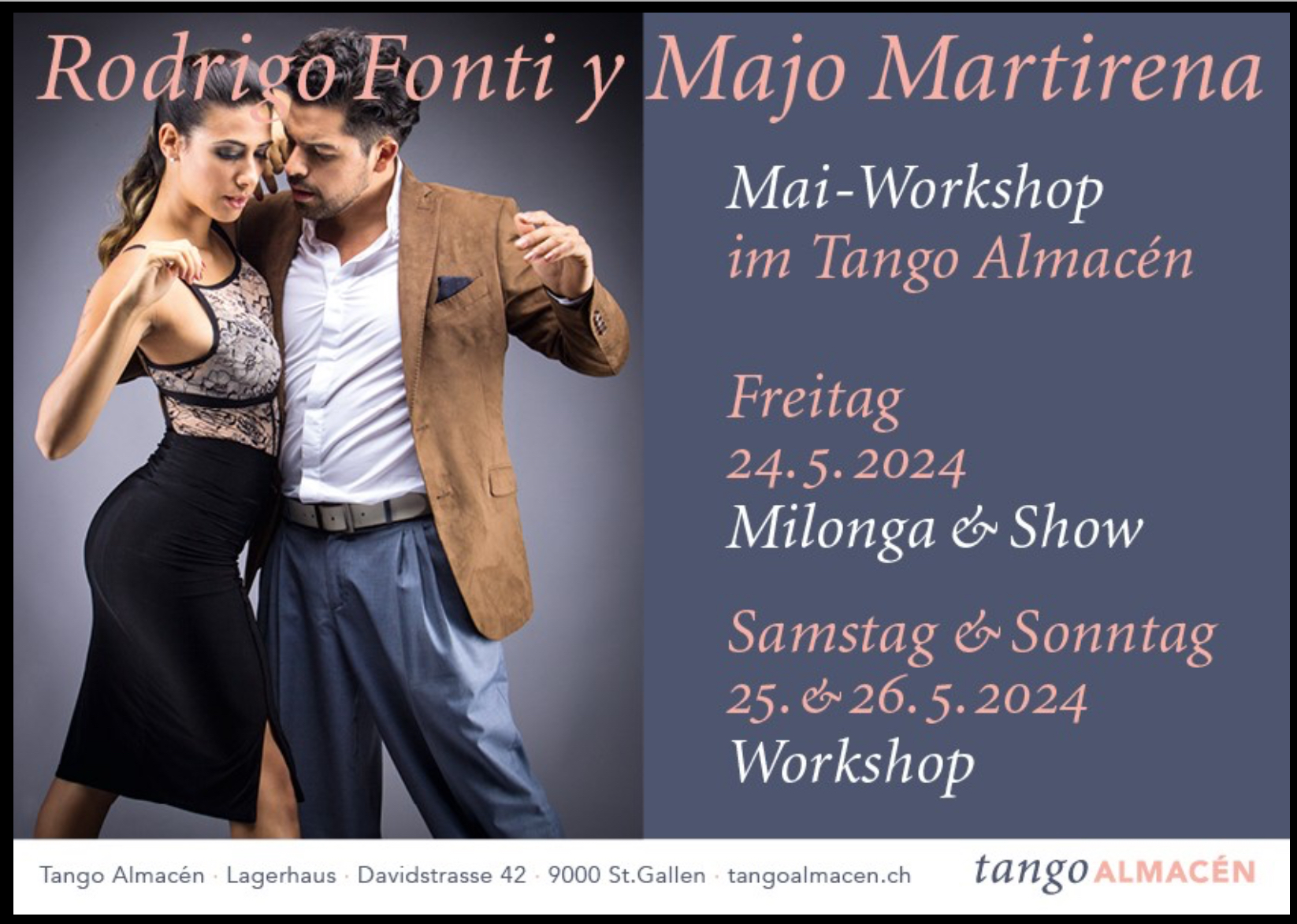 Schnellentschlossene erhalten bis 1. Mai 10% Rabatt. Siehe https://www.tangoalmacen.ch/rodrigo-majo-202405/