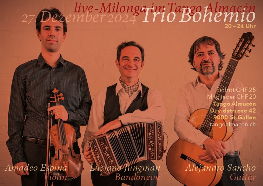 Milonga ab 20.00 Uhr, das Trio Bohemio spielt live; davor, dazwischen und danach legt DJ "El viejo" auf.