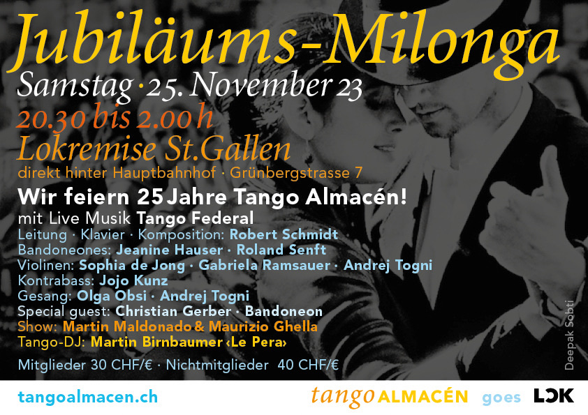 Wir freuen uns mit euch am Samstag, den 25.11.2023 ein Fest mit Highlights feiern zu können. 25 Jahre Tango Almacén ist dank den vielen Besuchern, den unermüdlichen Helfern und einem tatkräftigen Vorstand möglich geworden. Für uns spielt Tango Fédéral, Ltg. Robert Schmidt; aus Berlin Christian Gerber am Bandoneon als Specialguest; am DJ-Pult Martin Birnbaumer „Le Pera“. Snacks zwischendurch und mit einem Cüpli stossen wir auf unser Jubiläum an. Seid alle herzlich willkommen! Tickets gibt es an der Abendkasse oder unter https://eventfrog.ch/25-Jahre-Almacen
